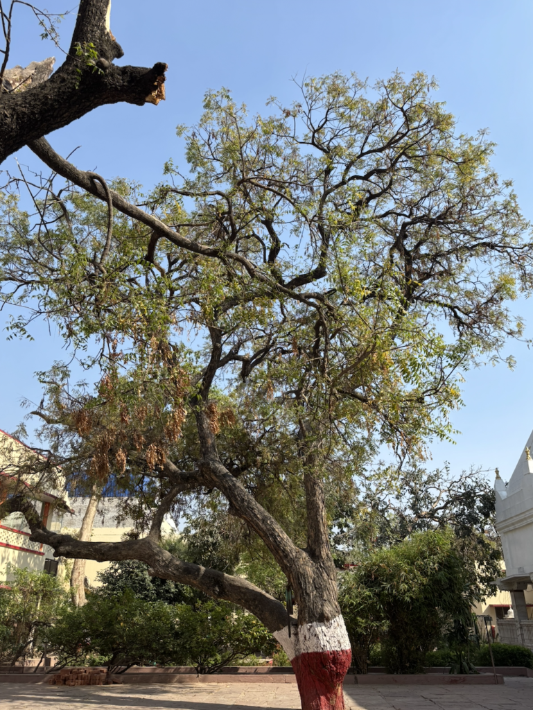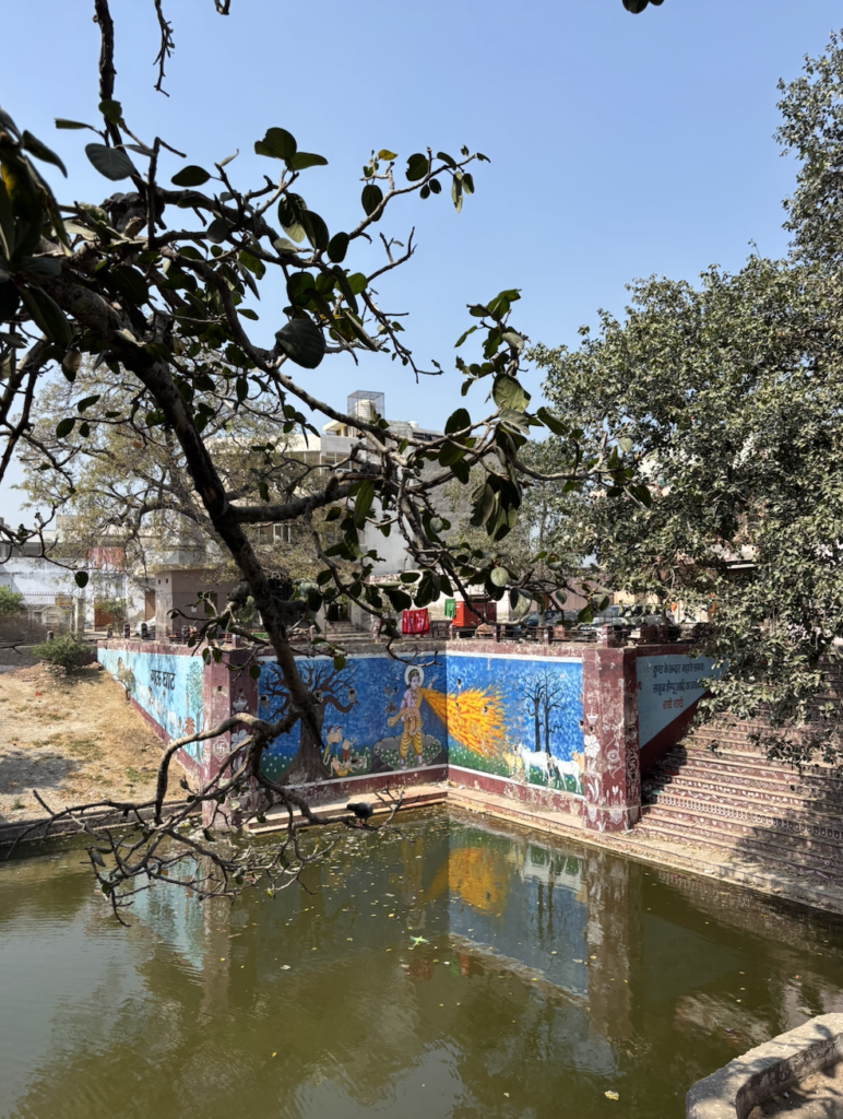 Behind us was a large, albeit a very dirty pond. I later came to know that it’s called Davanal Kund and it’s also linked to one of the million Leela’s of Krishna. There was an old shop in the distance and a large tree was shielding us from the sun.